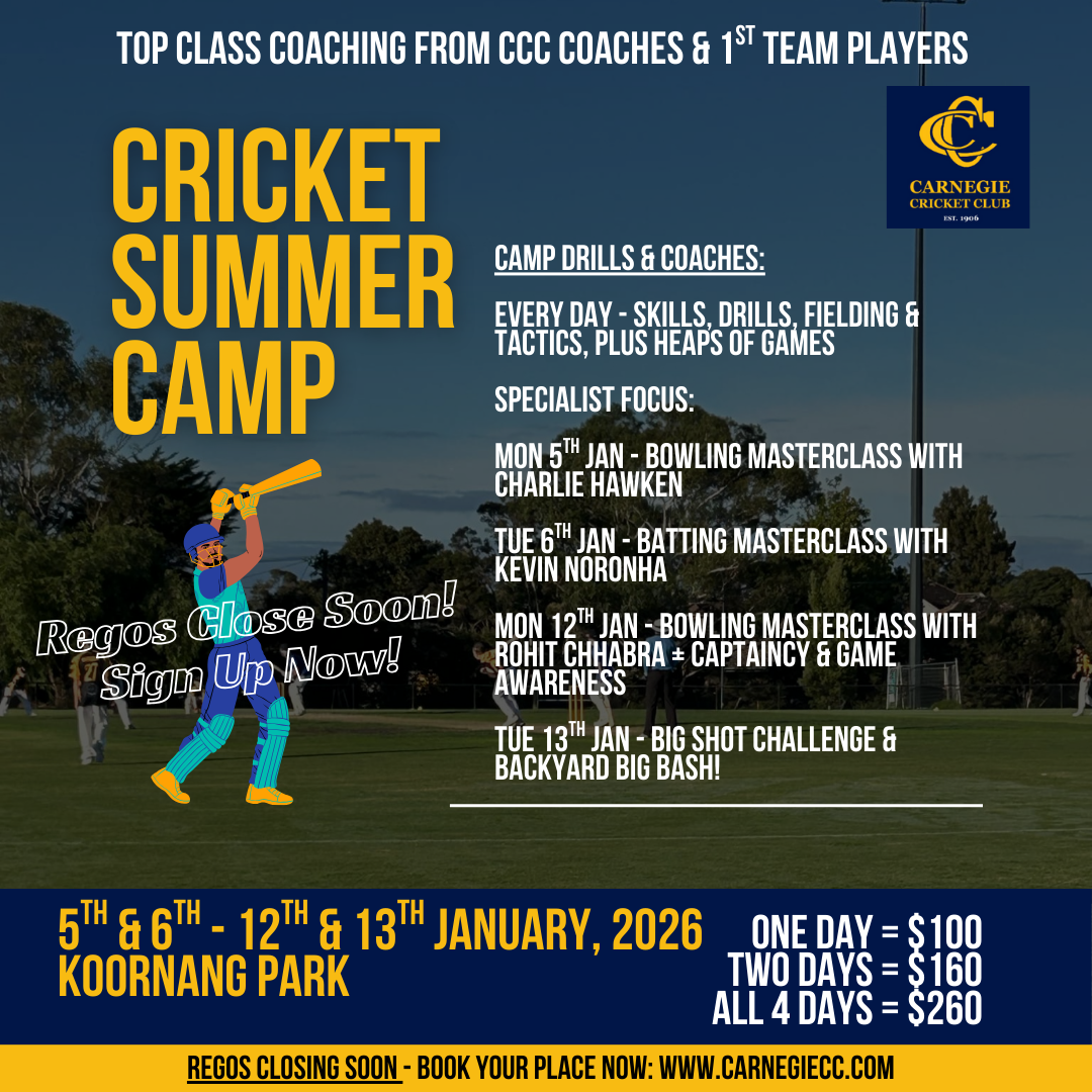 This Summer, join Junior Head Coach Charlie Hawken for an epic Cricket Summer Camp at Koornang Park. Charlie is very excited to run a special cricket camp for Carnegie CC Juniors. He has experience of summer camps at other clubs and they are always fun, with plenty of...